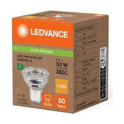 Ledvance LED PAR16 GU10 Riflettore 2W 360lm 36D - 827 Bianco Molto Caldo | Sostitutiva 50W