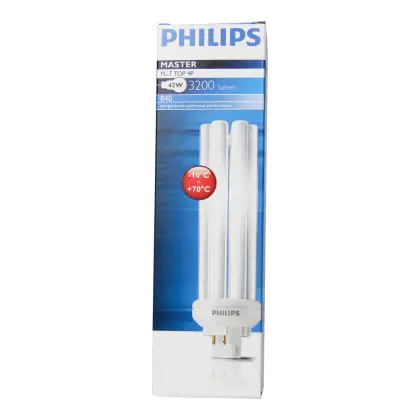 Le Philips PL-T TOP 42W 840 4P (MASTER) sono lampade fluorescenti compatte a basso contenuto di mercurio davvero efficienti. Queste lampade fluorescenti a basso consumo sono un'ottima scelta in termini di rispetto dell'ambiente anche perché hanno una lunga vita. Esse inoltre assicurano performance ottimali di illuminazione per periodi di funzionamento lunghi. L'attacco di queste lampade é del tipo GX24q-4 ed é dotato di 4 pin (perni). La potenza di tali lampade é di 42W. Ricorda: quando sostituisci le tue lampade fluorescenti compatte devi mantenere il medesimo attacco, numero di pin (perni) e potenza delle tue vecchie lampade, altrimenti non sarai in grado di procedere con l'installazione.